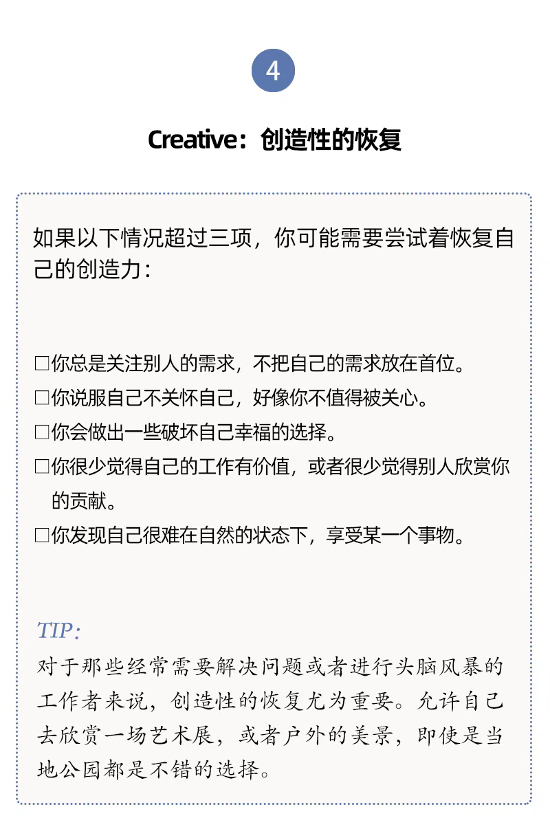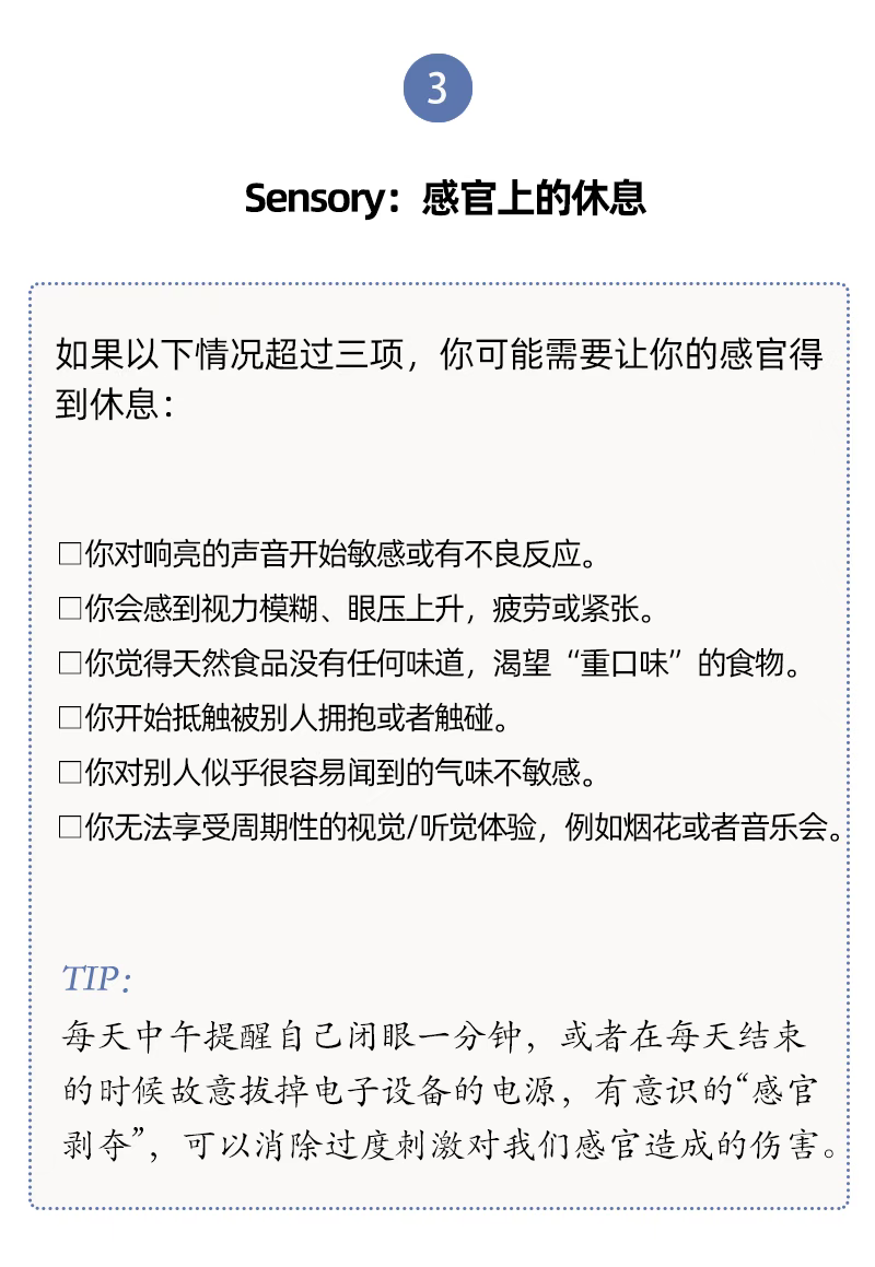 人们对于休息有不同层面的需要,休息与每一天的生活息息相关。单靠某一个具体的假期、某一种具体的活动(社交或者睡觉),并不能让我们恢复到完全休息好了的状态。