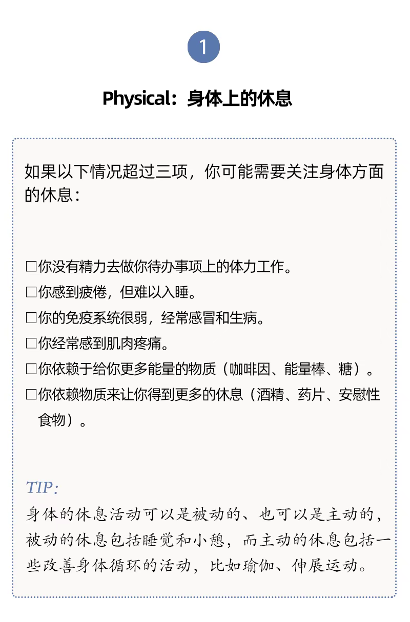 有内科医生根据研究和临床经验,提出了7种类型的休息方式,帮助我们确定最需要哪一种。